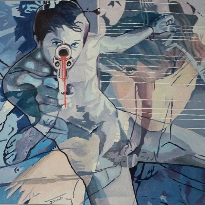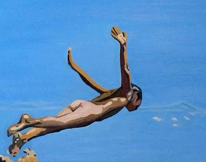 Całkiem nowa praca w tym roku - nazwana po prostu: skok - została wczoraj ukończona i również schnie. Było kilku innych pretendentów do nazwy (błękit, wolność, swoboda itd itp...) ale, że jestem przeciwnikiem urabiania wszelkiej filozofii ponad miarę, zostajemy przy zwykłym określeniu czynności, która tak czy siak, może być rozumiana metaforycznie. A na deser - dziś w zamierzeniu jeszcze mały collage. Następną większą pracą będzie silos albo czarnobyl_2, zależy jak mi podpasuje.